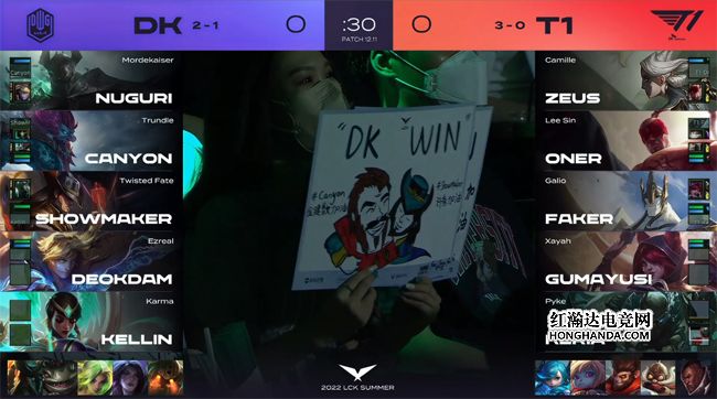 北京时间6月25日,LCK夏季赛第二周的周六焦点战由3连胜的T1对阵积分2-1的DK。首局Nuguri和Zeus先后打出对位单杀,不过T1中期的运营节奏更胜一筹,Canyon的巨魔在河道探视野时被抓死,T1得以无压力收下大龙,最终2-0击败DK解锁四连胜!
