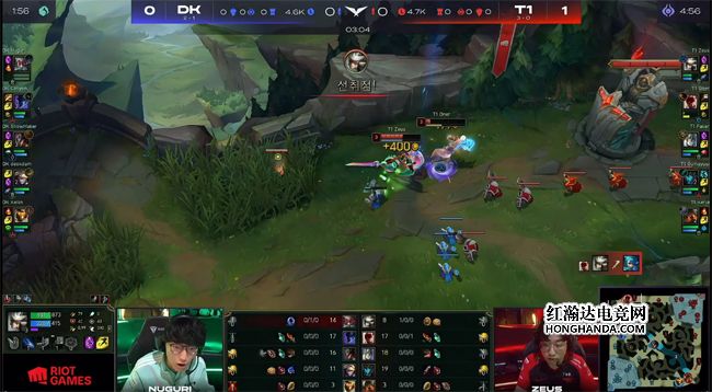 DK上、中路遭重后下路也难逃一劫,巴德去河道做视野时不慎被泰坦钩中,卡莉丝塔闪现补伤害拿到人头,T1三线全面开花,盲僧还控下水龙加峡谷先锋,巴德没能及时赶往中路大招保塔,先锋成功撞掉了DK一塔的镀层,T1的局势一片大好。11分钟梦魇开大尝试抓加里奥,Faker的加里奥大招飞往小龙河道,跟打土龙的队友会合,DK选择接小龙团战,可是EZ开E跳脸输出时被泰坦QR击飞瞬间阵亡,T1一路追击打出0换3节奏起飞!