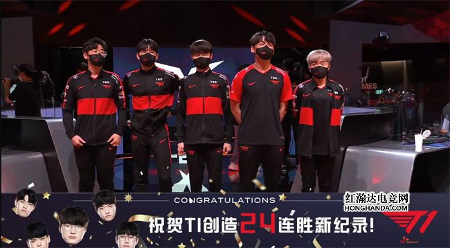 中期DK主动抱团求战,在中路打出1换2后抢到风龙,打断了T1的龙魂节奏。T1则趁DK回城的时间差rush掉大龙,中辅卖自己保住了三个“龙种”。DK上路也被通关,格温和卡莉丝塔互换倒地,DK才保住了下路二塔。27分钟Faker的加里奥发现DK众人在小龙河道做视野,果断地隔墙闪现W秒嘲讽到DK五人,帮助T1打出2换3解锁了龙魂。最终T1故技重施rush掉第二条大龙,摧枯拉朽打出0换5团灭DK一波结束比赛,2-0击败DK收获四连胜!同时T1在此战过后创造了LCK联赛前无古人的24连胜新纪录!