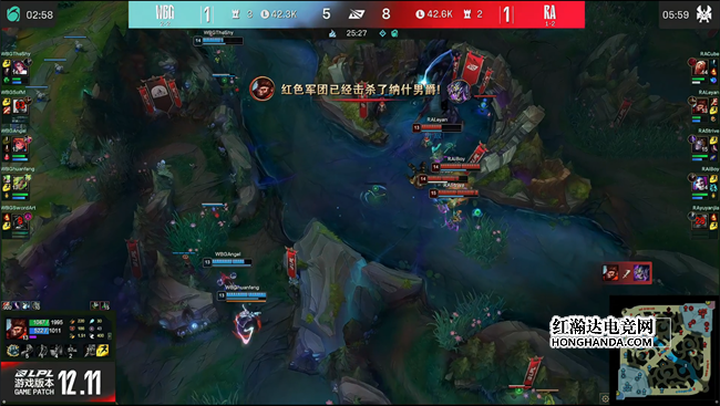 两队在中期陷入僵持拉扯了许久,25分钟RA抱团进入上半野区布置视野时发现了落单的烈娜塔将其击杀,借机开始Rush大龙,WBG四人在河道尝试干扰,盲僧遭到集火阵亡,虽然泰坦也被击杀,但WBG还是无法阻挡RA拿下大龙Buff。WBG转而在下路三包一抓死单带的发条,紧接着就被RA大部队包围,烈娜塔和盲僧先后阵亡,佐伊在野区回城被视野发现,猴子轻松将其击杀。RA在短短的几分钟内杀人拿龙加推塔,迅速拉开了经济差距。
