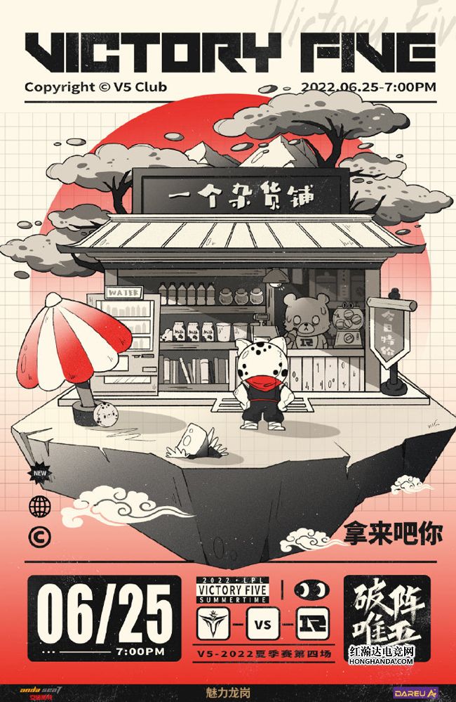 V5的海报标题是“拿来吧你”,吉祥物小黑豹来到RNG吉祥物软泥熊营业的“一个杂货铺”,看到店外挂着“今日特价”的旗子,便想巧取豪夺中饱私囊。目前V5手握3连胜排名第二,加上第三名TES今天也有比赛,因此V5想要保住自己榜样的位置,今晚必须全力以赴!