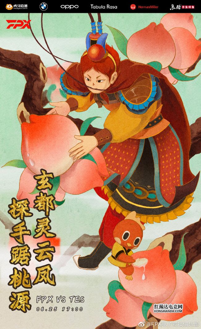 FPX的海报标题是“玄都灵云凤,探手踞桃园”,还原了《西游记》第五回的“名场面”——“乱蟠桃大圣偷丹 反天宫诸神捉怪”,FPX的小凤凰少年化身“齐天大圣”,和吉祥物小伙计准备在蟠桃园大快朵颐,TES辛辛苦苦栽培的水蜜桃都将难逃一劫~