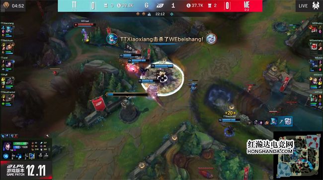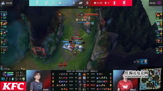 开局TT中、下两路手握线权,佛耶戈打土龙时WE选择赶来接团,虽然佛耶戈拼惩戒拿到了土龙但送出了一血,妖姬交闪现拿到佛耶戈的人头。