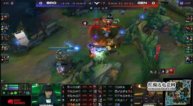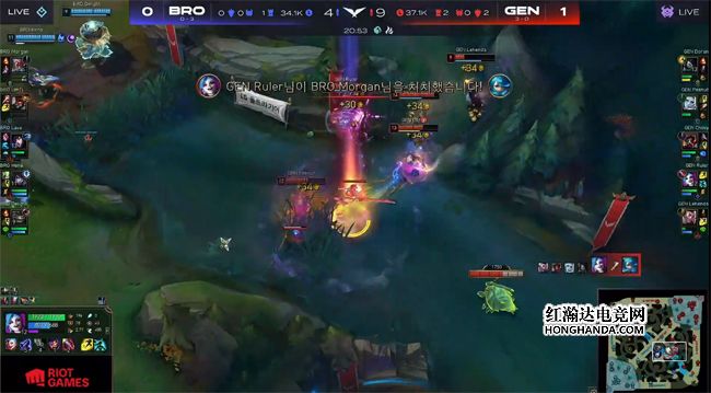 BRO正面受挫后选择去边线抓单,GEN付出剑魔被抓死的代价通关了BRO上路加中路一塔,滚起了3千的经济雪球,回城补了一波装备果断rush掉海克斯小龙,晚来一步的BRO不愿放人,蹲在草丛的泰坦反而被GEN先手强开,阿狸三连魅惑全部命中,GEN一路追到BRO中路二塔处打出0换4大获全胜,回身无压力收下大龙!Ruler的老鼠在BRO的蓝buff野区隔墙射出双杀,BRO双C不慎阵亡,GEN得以推掉中、下两路水晶,两队经济差已经超过了1万。最终GEN虐泉0换3一波结束比赛,1-0先下一城!