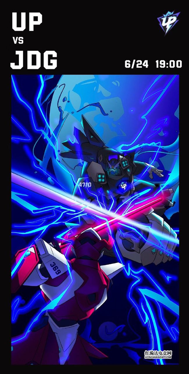 UP的海报标题为“机 战”,双方均派出了机甲武士上演“光剑格斗”!这场比赛上路的对决是一大看点——“公爵”Zoom在今年之前一直效力于JDG,和Yagao都是JDG的“元老”级选手,今晚他将率领UP直面老东家,不知能否终结JDG的四连胜?让我们拭目以待!