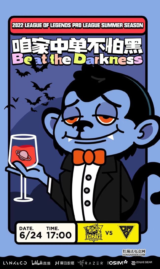 LNG的海报标题为“咱家中单不怕黑”,美工整了一手好活儿——端着红酒杯的“黑猴”化身吸血鬼,准备将杯中新鲜的血液一饮而尽,这自然暗指Doinb~喜提三连胜的LNG是JDG、V5、RNG之外唯一保持着不败的队伍,今天小麒麟志在冲击4连胜和“榜眼”宝座!