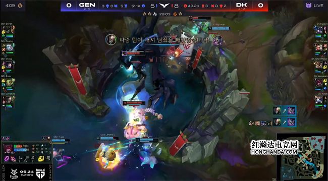 GEN利用下路对线的优势控到风龙,刚刚复活的霞把兵线推过河道后再次遭重,炼金先手W减速到霞,“启封的秘籍”换了虚弱令霞寸步难行,泽丽补伤害将霞带走,同时佛耶戈还击杀了峡谷先锋,顺手gank上路击杀了猪妹,DK的节奏处处受制。12分钟Nuguri的猪妹在上路单杀了Doran的船长,GEN又在小龙团战中损兵折将,DK打出0换2控下火龙,稳住了前期节奏。GEN立刻调整了策略,由船长在上路单带,正面则抱团rush掉土龙,虽然阿狸和奇亚娜互换倒地,但船长直接通关了DK上路完全不亏。
