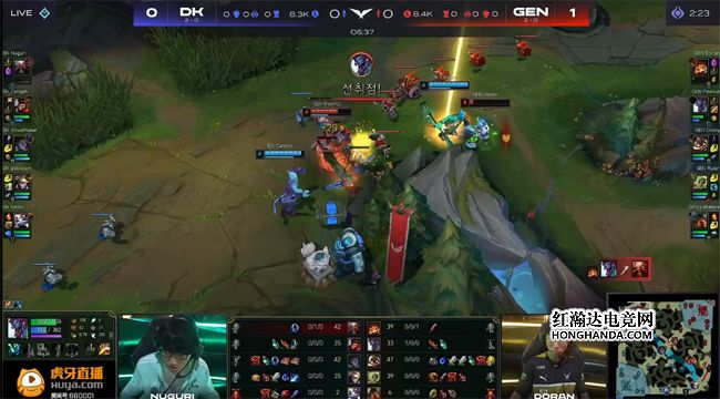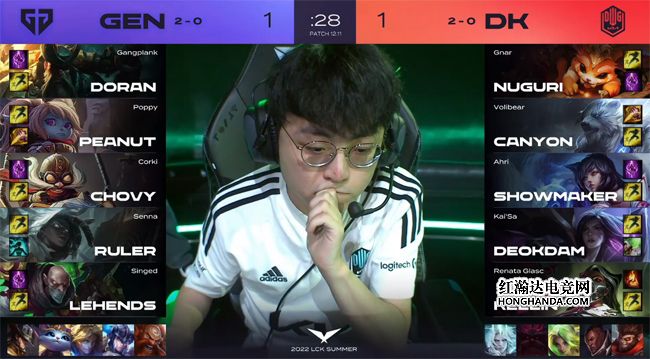 大龙出生前DK付出酒桶被抓死的代价,抱团rush掉火龙。中期GEN继续“军训”酒桶,Nuguri的酒桶被抓成了0/5/1发育炸裂。24分钟DK中、下三人在GEN的蓝buff野区截住了落单的飞机,Chovy的飞机W撞墙被秒掉,DK上野在河道牵制住GEN四人,等双C过来打出1换4,无压力将大龙收入囊中!GEN下路水晶告破,经济落后4千。飞机等到炸药包刷新和队友打大龙逼团,DK前后包夹先行击杀泰坦,上、中双传送偷家结束比赛,1-1扳平了比分!