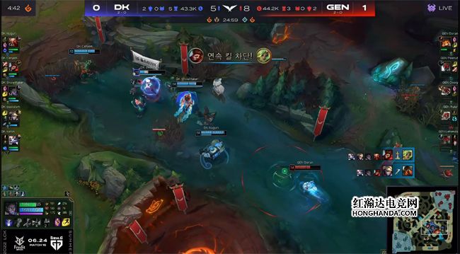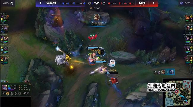 开局狗熊3级gank上路,不过自家小兵暴露了自己的位置,船长及时回塔稳健发育。波比则选择绕后抓中,打出了阿狸的闪现。DK下路这一局继续抗压,赛娜无压力一打二的同时炼金游走到中路,逼出阿狸的大招。7分钟狗熊入侵GEN的野区时被发现,飞机拿到了一血。