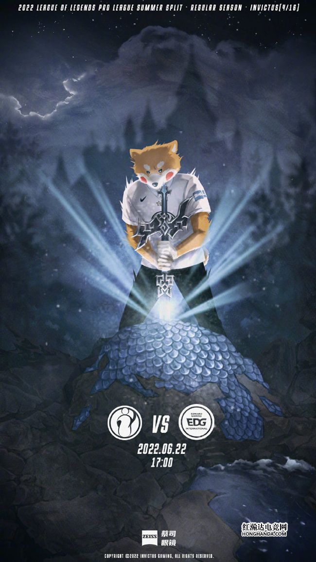 iG的海报标题是“试炼,石中银鳞剑”,借鉴了英国家喻户晓的传说“石中剑”——能拔出石中剑的人定当加冕为王。iG吉祥物小柴犬正要拔出插在EDG银鳞巨石中的长剑,剑身迸射出的光芒似乎也在回应着iG。