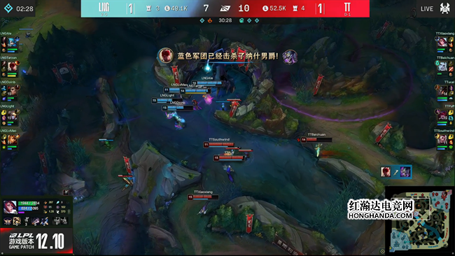 TT偃旗息鼓一段时间以后继续通过双卡双带体系找机会,围绕发育最好的卡莉丝塔发起进攻,20分钟出头在野区抓死了落单的纳尔后压进中路一塔,但卡牌冲动的决策大招深入LNG野区,导致前来救援自己的队友都被LNG大部队包夹,LNG打出1换2以后立刻去开大龙,TT硬着头皮前来抢龙却被纳尔拍晕三人,LNG拿下大龙并且击杀男枪,彻底追回了落后的资源和经济。