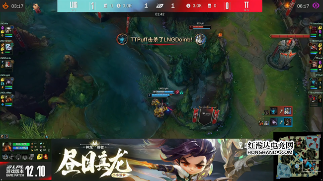 还没等LNG利用大龙Buff展开推进,又一条小龙已经刷新,两队集结河道展开决战,虽然LNG拿到了小龙但他们的开团太过心急,TT且战且退击杀LNG三人,接下来TT从下路推进高地想要强拆基地结束比赛,但满状态格温背靠双子塔战斗力惊人守住了进攻,TT撤退不及被复活的LNG队员打出1换3。两边复活出来以后LNG又找到机会抓死剑姬拿下大龙Buff,在中路推进逼退TT以后转头拿到海克斯龙魂,TT来迟一步想要开团结果被LNG逐个击破,LNG从中路强势推进一波结束比赛,以2:1的比分险胜TT取得胜利。