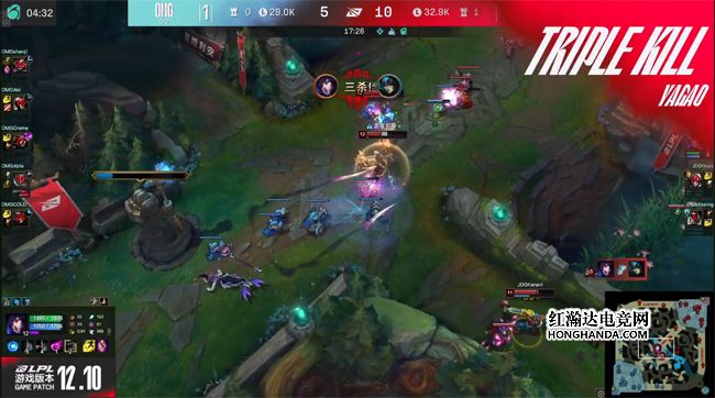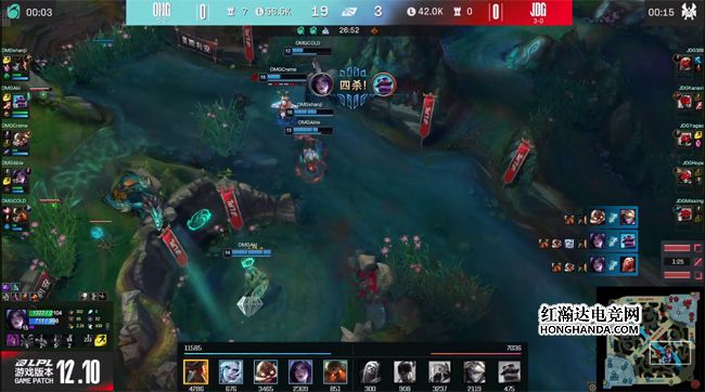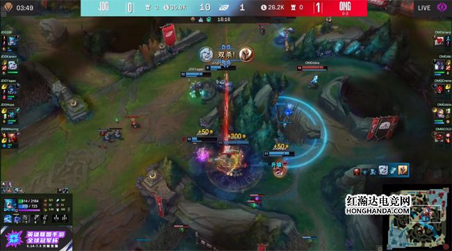 前期JDG下路手握线权,男枪得以控下海克斯小龙,随后双方中野在峡谷先锋河道遭遇,OMG双刺客的爆发伤害更高,妖姬拿到男枪的人头及双buff。9分钟369的赛恩蓄满的Q技能击飞了凯南,果断接大招再度将其撞飞,凯南开出大招闪现进塔,赛恩一记帅气的闪现预判Q完成了对位单杀!同时男枪gank下路得手,OMG双人组阵亡,EZ单吃了下路一血塔发育起飞~OMG的下半野区随之沦陷,中路一塔的防守压力骤然增大。大龙出生前OMG在下路河道先行带走JDG双人组,JDG三打五打出0换5,团灭OMG大获全胜!