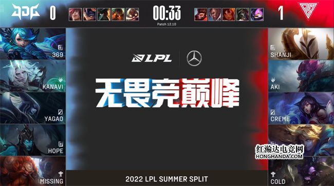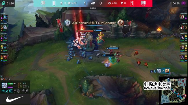大龙出生前JDG双C在自家野区阵亡,OMG提速拔掉五座外塔,同时手握两条小龙,经济领先9千。中期OMG抢先落位小龙河道,打出0换3“听牌”了水龙魂,减员严重的JDG只能目送OMG收下大龙。船长上路单带时被JDG上中野抓死,不过OMG也在中路击杀了JDG双人组,推掉中路水晶后双方经济差接近一万五。26分钟JDG在小龙河道背水一战,COLD的泰坦先手Q钩到沙皇,Creme的飞机携带炸药包传送绕后分割阵型,帮助卡莎斩获四杀,OMG摧枯拉朽打出0换5团灭JDG,平推中路一波结束比赛,1-0先下一城!