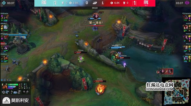 开局FPX四人蹲在上路草丛,探视野的佛耶戈不慎遭重,阿狸闪现魅惑到佛耶戈,帮助霞拿到一血,因此RNG下路无法抢到线权。盲僧3级gank下路得手,洛拿到塔姆的人头,FPX回身控下海克斯小龙,前期的节奏非常流畅。