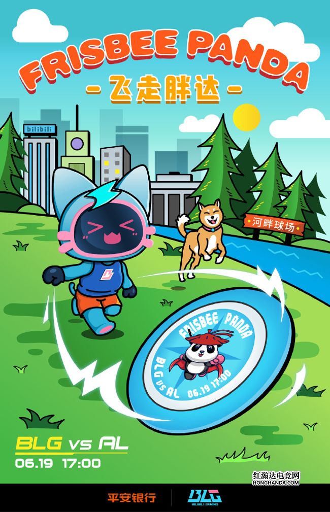 BLG的海报标题为“飞走胖达”,BLG的吉祥物“小电视喵”正在河畔球场跟狗狗玩飞盘游戏,飞盘上印着的正是对手AL的侠客熊猫~两队积分同为1-1,因此这第2分对双方都至关重要,Bin和国产上单新秀Zdz的对决值得期待!