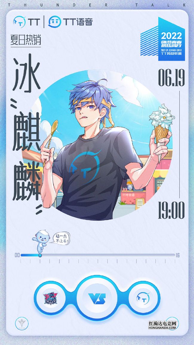TT的海报标题为“夏天就吃冰‘麒麟’”,代表TT的蓝发少年正在吃小麒麟形状的冰淇淋,下方有比赛小贴士——“稳一点,不上头”。TT在夏季赛首秀对阵V5时一度打出了不小的前期优势,但中期上头开团葬送了好局,不知今晚TT能否打出一场漂亮的收官战呢?