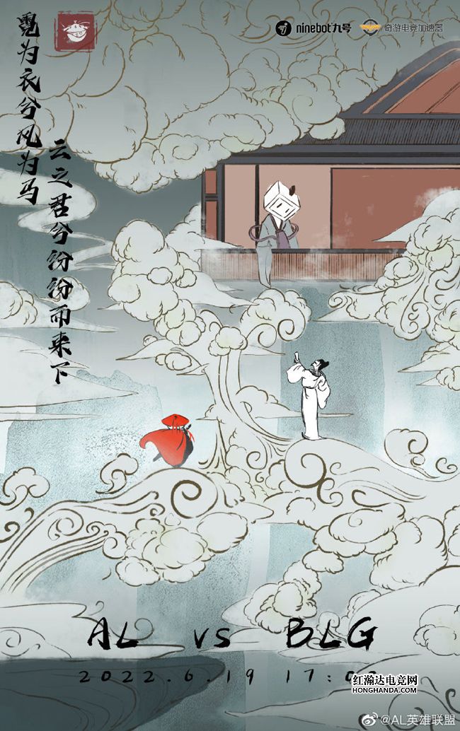 AL的海报标题是“霓裳羽衣”,海报左侧的诗句出自唐朝“诗仙”李白的《梦游天姥吟留别》——“霓为衣兮风为马,云之君兮纷纷而来下”,本意指仙子们以彩虹为衣、以风作马,脚踏着祥云纷纷飘然而下,海报中则是AL的吉祥物侠客熊猫和李白脚踏着祥云来到BLG小电视仙子所在的仙阁。