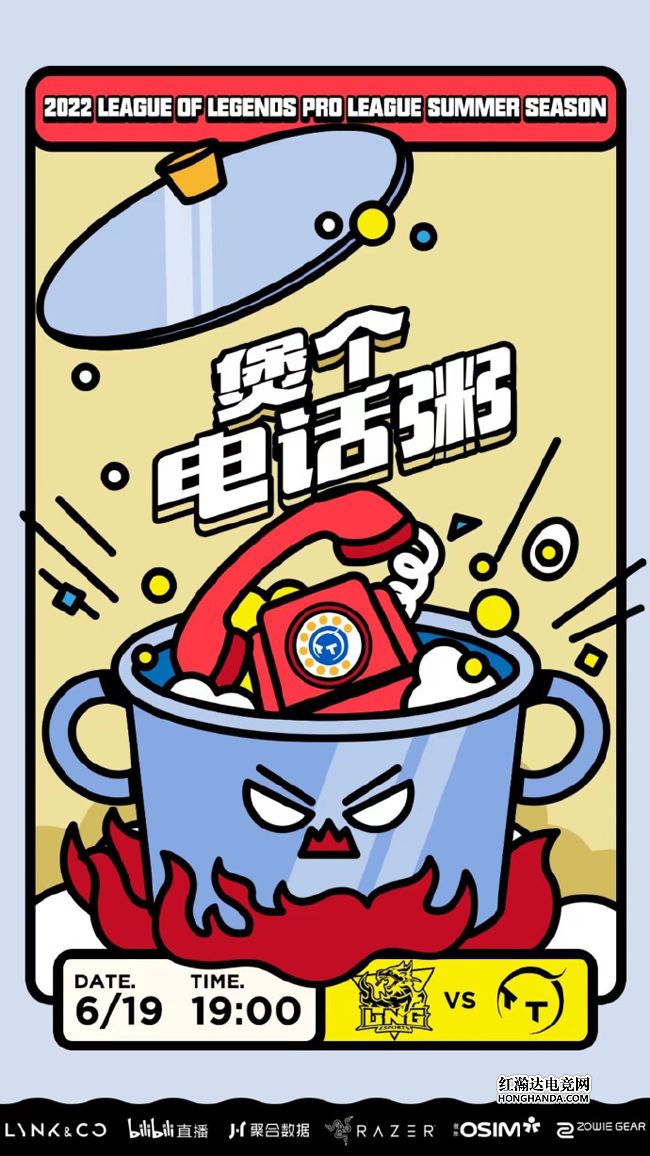 LNG的海报标题是“煲个电话粥”,硬核诠释了“煲电话粥”的含义——LNG直接把标有TT队标LOGO的电话机扔进大铁锅里面“物理煲粥”~LNG和V5一样打出了一波两连胜,但是小分不如V5多,因此只能屈居第三。如果今晚LNG干净利落地拿下TT,那么将反超JDG登上榜首!