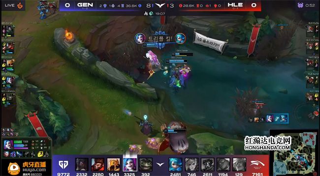 大龙出生前HLE下路也被通关,虽然抱团拿到了第二只先锋,但GEN在小龙河道各个击破打出0换5,势如破竹团灭HLE大获全胜!HLE的外塔仅剩中路二塔,经济落后9千。GEN“听牌”了火龙魂,回城补满状态后大举入侵HLE的红buff野区,蔚和赛娜陆续阵亡,GEN打出0换3惩下大龙,上、中分推齐头并进,虐泉1换4一波结束比赛,节奏行云流水先下一城!