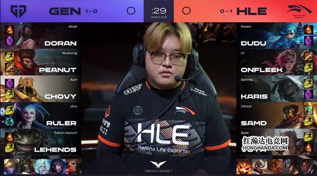 大龙出生前GEN“听牌”了风龙魂,HLE下路一塔失守,经济落后3千。中期GEN在小龙河道抓死了纳尔,即使HLE集火反杀了猪妹,GEN也顺利地解锁了龙魂。24分钟在上路单带的维克托脸探河道草丛,不料GEN众人就在埋伏,集火秒杀维克托回身果断rush掉大龙,HLE中路高地塔失守,经济落后8千。HLE选择在远古巨龙刷新后放手一搏,绕后的猴子被发现,GEN得以分割了HLE的阵型,摧枯拉朽打出0换5团灭HLE一波结束比赛,2-0轻松击败HLE拿到两连胜!