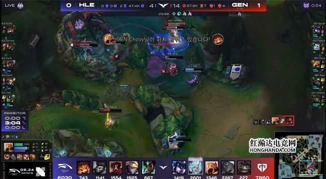 前期HLE中、下都沦为突破口,在下路遭到线杀后GEN中野抓住维克托闪现转好前的时机,由Chovy的阿兹尔大招回旋推先手留下维克托,佛耶戈和下路组补伤害帮助阿兹尔将其带走,佛耶戈顺手控下海克斯小龙,HLE只能击杀峡谷先锋作为止损。GEN抱团守住了下路一血塔,随后佛耶戈gank下路,GEN越塔三抓二打出0换2,HLE唯一的优势点只剩上路的纳尔。15分钟纳尔在下路一打二留下了GEN双人组,然后演变为全员团战,GEN打出2换3完全不亏。