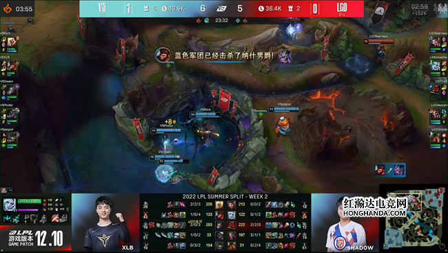 2022 LPL夏季赛常规赛第二周第六天,LGD战队迎战深圳V5,第一局前期LGD取得了不错的优势,但进入中后期以后双方在团战决策中屡屡出现失误,让局势僵持到50分钟才由V5顽强拿下比赛胜利,第二局V5调整战术以后又是通过中期的防守反击化解了LGD的主动进攻,快速平推拿下了比赛,恭喜V5 2:0战胜LGD。
