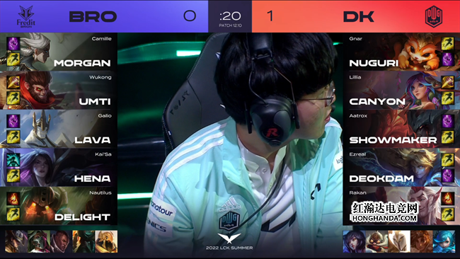 2022 LCK夏季赛常规赛第一周第二天,DK战队赛季首战对阵BRO。这是S10冠军上单Nuguri回归老东家以后的首秀,第一局双方都选择了前排居多的超级后期团战阵容,导致他们在非常长的时间里没有爆发一血,最后在34分钟DK赢下大龙团战一波结束比赛。第二局DK手握巨大优势险些被BRO冲阵翻盘,但最后BRO还是犯下了致命失误被DK再度逆转,0:2落败。