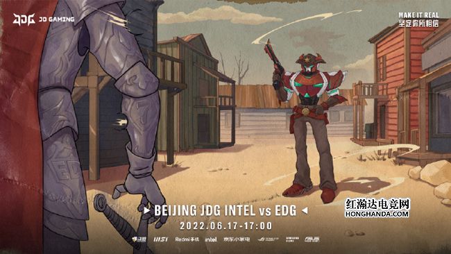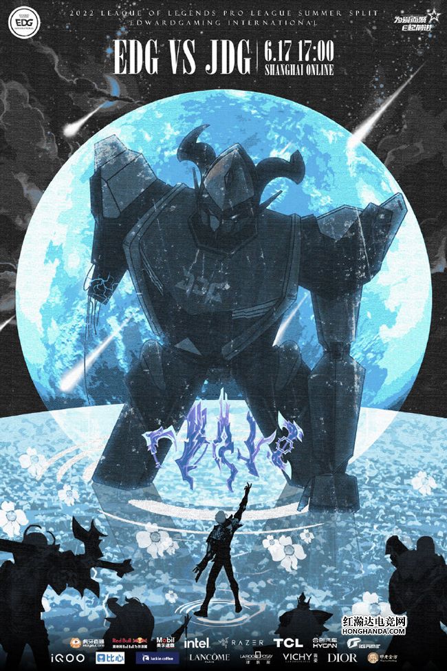 JDG的海报标题为“电光火石”,海报延续了前两场的美国西部片风格——代表JDG的“机甲牛仔”和EDG骑士上演了西部片中的经典要素“牛仔对决”,骑士的冷兵器在激光枪面前不堪一击,电光火石之间就决出了胜负。Hope将在本场直面老东家,哪支队伍能拿下三连胜呢?