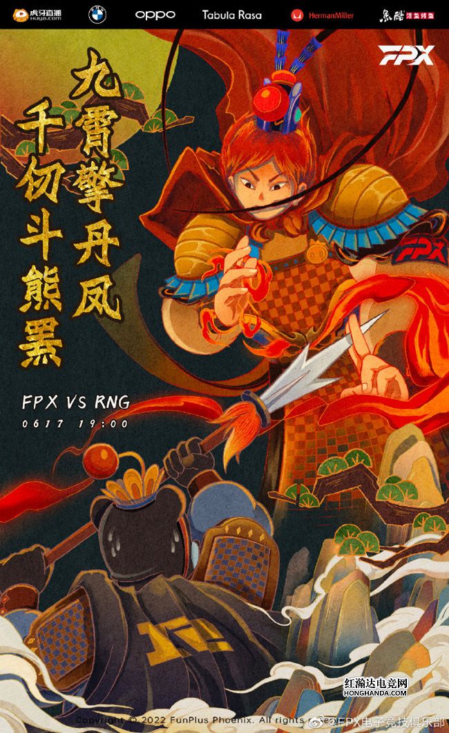 FPX的海报标题为“九霄擎丹凤,千仞斗熊罴”,海报仍然是“西游主题”,与齐天大圣 孙悟空同款打扮的小凤凰少年在上一场打败四大天王后,这一场转而迎战“二郎真君 软泥熊”,RNG的吉祥物软泥熊手中的三尖两刃刀被大圣单手夹住,脑后直冒冷汗,明显已经落于下风。FPX自开赛至今遭遇两连败,今晚究竟是RNG解锁夏季赛首胜,还是FPX终止连败?让我们拭目以待!