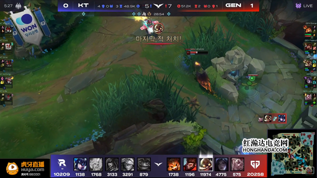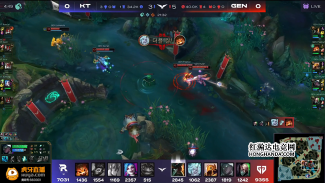 转眼间海克斯龙魂已经刷新,两队在河道展开了非常惨烈的拉锯战,KT集中火力首先秒掉了纳尔,让己方在一段时间里处于5打4的状态,但GEN一边躲避KT的开团,一边通过飞机的导弹不断进行Poke,把KT五人都骚扰到半血,KT通过回城补血然后TP赶回战场,强行拿到了海克斯龙魂,但卡莎与飞机兵分两路将阵型溃散的KT逐个击破,最终将KT团灭!飞机在这波团战里打出了超过1万1的恐怖伤害,帮助GEN赢下团战并且顺势拿到了大龙Buff。