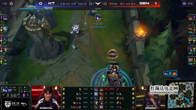 两边平稳发育了10分钟,佛耶戈终于找到机会在上路Gank击杀了纳尔拿到一血,与此同时塔姆在GEN野区做眼发现了落单的赛娜,果断交闪将其留下,大快朵颐配合金克丝远程支援的超究极死神飞弹把赛娜带走。GEN顺势推掉上路一塔,把船长换到下路单带,结果船长在自家野区偶遇KT野辅两人不幸阵亡,KT在这段时间加紧对下半区的控制,连续拿到两条小龙。GEN通过分推运营保持着经济优势,但他们必须要在第三条小龙处和KT进行正面决战。
