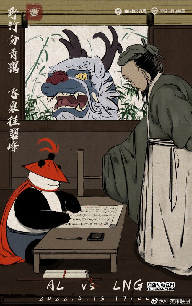 AL的海报标题为“南山有竹”,左侧的诗句出自唐朝“诗仙”李白的《访戴天山道士不遇》:野竹分青霭,飞泉挂碧峰。AL的吉祥物熊猫侠客已经写出了一份看上去还不错的答卷,而窗外的小麒麟因为迟到不能进屋,恐怕要得0分了。两队都拿到了夏季赛首胜,不知哪支队伍能率先解锁两连胜呢?