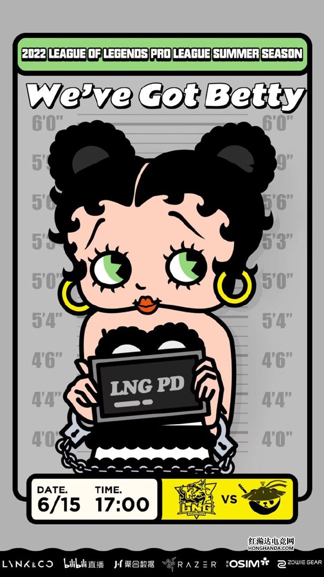 LNG的海报标题是“We've Got Betty”(我们已经抓到了Betty)。手拿“LNG PD”信息板的“性转Betty”正在拍摄“入狱照”,暗示LNG今天将针对AL下路,让Betty好好体验一把“塔下坐牢”的感觉~