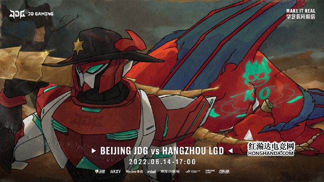 JDG的海报标题是“以战止战”,化身为“屠龙勇士”的JDG绯红机甲击杀了LGD吉祥物红色巨龙,并且锯断了巨龙的一根龙角作为战利品。JDG在夏季赛首秀中2-1击败了TES,撕下了以往赛季“慢热”的标签,今天面对纸面实力稍逊一筹的LGD有望拿到两连胜。