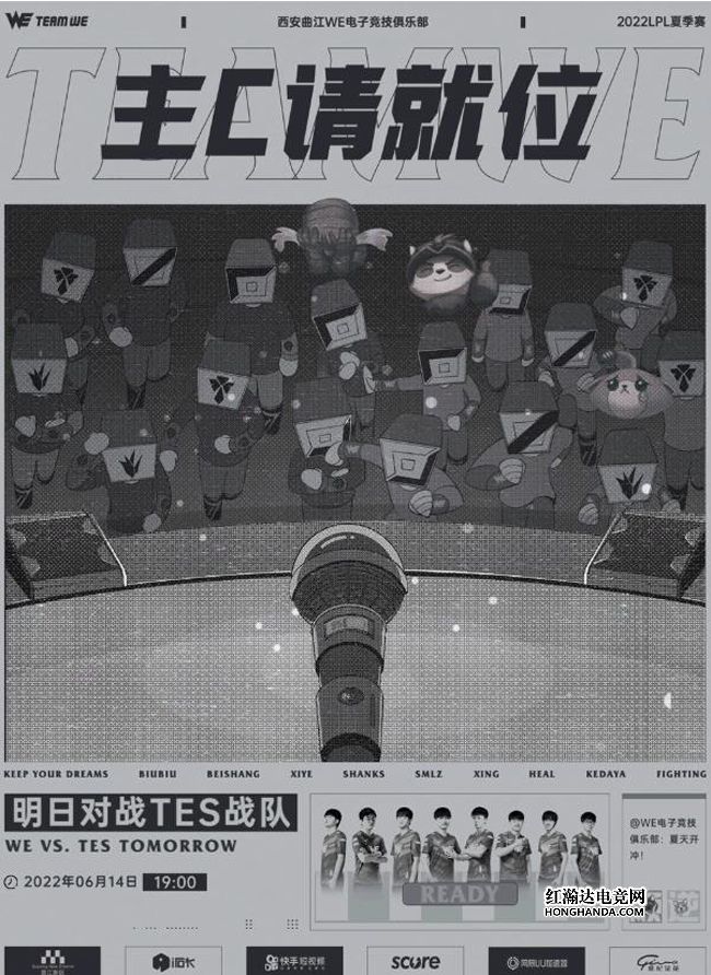WE的海报标题为“主C请就位!”海报的C位是舞台上麦克风,舞台下面是标着《英雄联盟》五个位置的一众键帽小人,他们争先恐后地想要上台表演,其中还夹杂着TES上单Wayward在比赛中最爱亮的三个表情:“阿木木哭哭”“提莫点赞”和“猫咪哭哭”。由于Smlz和heal都在隔离期,因此WE这场的首发阵容为春季赛的主力阵容,他们曾在常规赛末段打出不错的成绩,完全可以和TES掰一掰手腕。究竟哪支队伍能够拿到夏季赛第一分?让我们拭目以待!