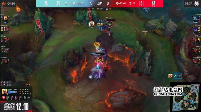 AL选出的“卢娜”组合并没有从RA下路手中讨到便宜,卢锡安抢到6级先发制人,赛娜和卢锡安互换阵亡,塔姆还配合游走而来的阿狸追死了娜美,RA打出1换2抢到了线权,作为交换盲僧击杀了峡谷先锋,放在下路想要推塔,RA付出梦魇的代价守住了一血塔,AL趁机控下海克斯小龙。15分钟梦魇偷第二只先锋时被AL的视野发现,AL众人赶到接盘了先锋,随后双方在小龙河道展开拉扯“点到为止”,RA控下了火龙并推掉中路一血塔,反观AL的先锋颗粒无收。