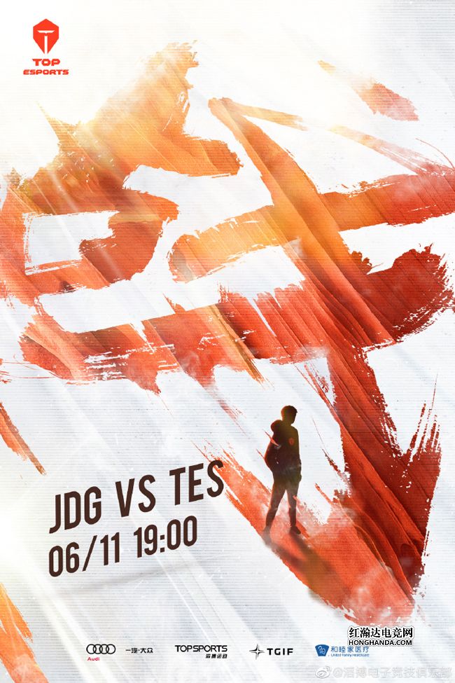 TES的海报标题为“战”。海报风格简约大气,TES选手在地面上泼墨挥洒出一个巨型的“战”字,橙色也是TES的LOGO颜色。TES在春季赛中依靠着“最佳第六人”369的失误拿下了JDG,今晚究竟是369成功复仇老东家,还是TES双杀JDG解锁夏季赛首胜呢?