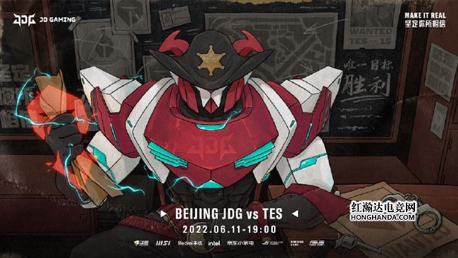 JDG的海报标题是“披坚执锐”,JDG的机甲武士化身为美式西部片中的小镇警长,正在通缉“重犯”TES哥。警长身后的黑板上挂着召唤师峡谷的俯瞰图和TES的队标LOGO,显然JDG已经将TES研究得明明白白,准备拿上手铐和左轮手枪踏上缉凶之旅。