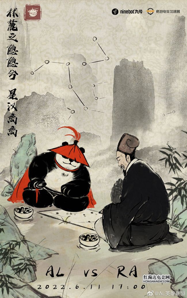 RA的海报标题为“Erosion”(侵蚀),头戴红色斗笠的侠客熊猫被腐蚀得面目全非,暗示AL将在比赛团战中被RA融化殆尽。RA面临着“内忧外患”的处境:新晋主教练Endless自职业选手时期就被粉丝们频频质疑,加上AL曾在春季赛2-1击败RA,不知RA能否顺利拿到首胜?