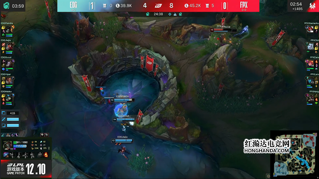 两队在中期围绕小龙等资源展开了激烈的争夺战,EDG利用残血中塔钓鱼反杀两人,FPX的经济都集中在猴子身上,一度陷入了劣势,但随着进入拉扯战,EDG阵容缺乏瞬间爆发的弱点开始暴露出来,FPX在龙坑的配合非常紧密,彻底限制了吸血鬼的进场,EDG拿下听牌龙后太过恋战导致吸血鬼阵亡,FPX趁机直扑大龙,蔚试图探查情况被妖姬直接秒杀,EDG众人只能无奈放掉了大龙Buff。FPX扭转局面推掉了下路高地塔。