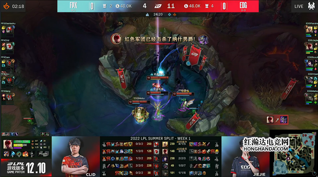 面对EDG气势汹汹的下路推进,FPX选择以攻为守殊死一搏,EDG众人且战且退,依靠塔姆的保护和天使的走A轻松摧毁掉FPX的阵线,一鼓作气推掉两路高地。FPX试图干扰EDG的撤退,结果又被天使砍下三杀,EDG顺水推舟结束比赛取得1:0领先!