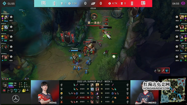 双方比较平稳地度过了前面5分钟,EDG下野汇合试图在河道拦截猴子,但没想到FPX中野辅三人都在河道附近,FPX一路追进野区拿下了蔚的一血,EDG集火反杀妖姬,FPX众人残血撤退。蔚随后赶到中路Gank妖姬,但镜花水月拖延了EDG中野的火力,猴子赶到救下妖姬又反杀了蔚。取得对位优势以后FPX以猴子为核心打的非常激进,但是EDG的防守非常到位,连续将其反杀,压制住了FPX即将起势的节奏,没有让对手滚起雪球。