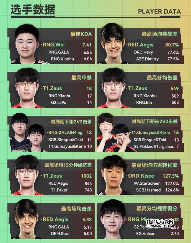 RNG下路GALA和Ming表现强势,拿到了最高的12次对线击杀,而T1下路组合Gumayusi和Keria则在对线期被2V2击杀16次。