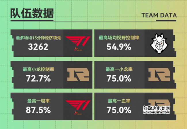作为走到最后的两支队伍,RNG和T1在多项数据上领先。其中T1拥有最高的场均15分钟经济领先和最高一塔率,而RNG在资源控制上表现更好,小龙控制率和一小龙率均为最高,超过70%,同时他们还拥有75%的一血率,前期优势明显。