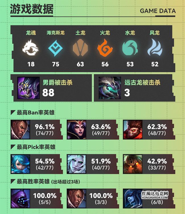 圣枪游侠卢锡安是本届MSI最让人忌惮的英雄,BP率达到100%,且登场的三场比赛全部获胜。全部比赛中,格温、佛耶戈是大多数队伍非常青睐的英雄,选取率超过50%。贾克斯虽然只登场五次,却拥有100%的胜率,堪称奇兵一枚,而丽桑卓在半决赛阶段被开发为反制阿狸的英雄,在多数对局中表现出色,胜率高达75%。