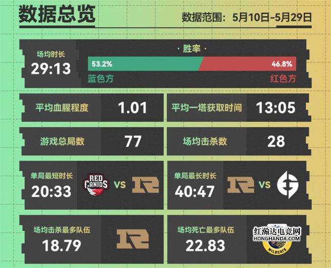 历时20天,MSI圆满落下帷幕,恭喜RNG勇夺冠军,成为第一支MSI三冠王。本届MSI共进行11场对局,场均击杀28个,场均时长为29分13秒,蓝色方胜率略高于红色方。
