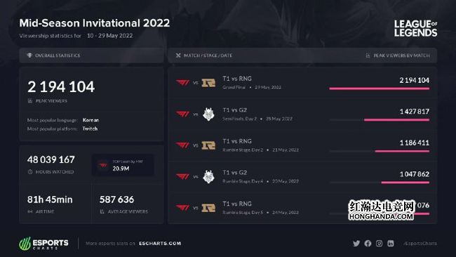 2022MSI季中冠军赛观赛数据(不包括国内平台):