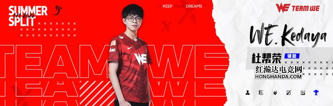 WE.Kedaya(杜帮荣),西安曲江WE电子竞技俱乐部英雄联盟分部辅助选手。自加入WE以来,Kedaya选手一直严格要求自己,努力提高自身,在不断拓宽英雄池的同时,全力增强与各个位置的协调配合。在夏季赛的舞台上,望他能继续突破自我,和队伍一起取得更好的成绩。