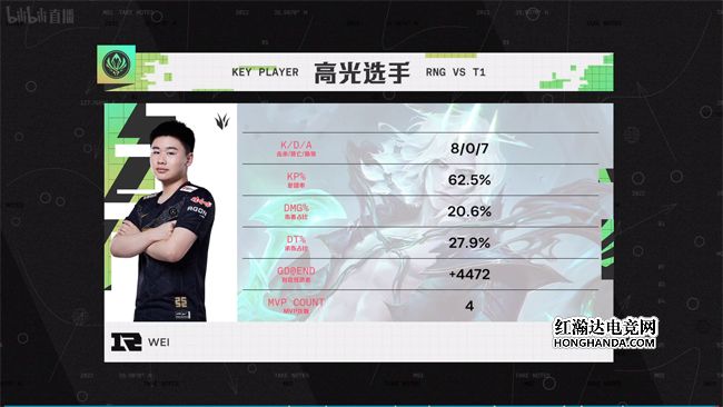 Wei在2020年作为ES战队打野亮相LPL,当时他的一手德玛西亚皇子 嘉文四世给观众们留下了深刻的印象,一度被各界称赞为“LPL皇子人柱力”。去年他转会加盟RNG至今,帮助队伍蝉联了LPL春季赛冠军,现在又成功卫冕MSI冠军,可谓是RNG当仁不让的前期“节奏发动机”。在今晚MSI决赛的第三局,Wei操刀佛耶戈砍下8/0/7的豪华数据并收获MVP,第五局配合Xiaohu的丽桑卓,在比赛前中期连续击杀了Faker的阿狸三次,帮助RNG成功带起节奏!